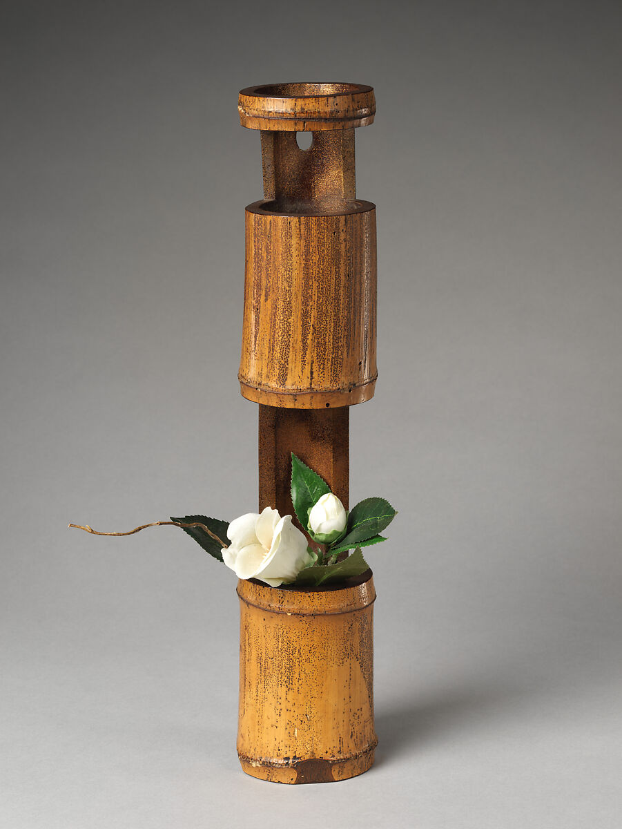 Cut from a single piece of bamboo, this double-windowed flower holder (hanaire) was created for the tea ceremony by Kōgetsu Sōgan, who mentions making it in his accompanying letter, now mounted as a hanging scroll. The son of Tsuda Sōgyū (died 1591), one of the San Sōshō (Three Greatest Tea Masters), Sōgan became a Zen monk of the Rinzai sect as well as the 156th head abbot of the Daitokuji Temple in Kyoto. In 1612 he built the famous Kohōan, a subtemple of Daitokuji, with the noted feudal lord, architect, garden designer, and tea master Kobori Enshū (1579–1647).