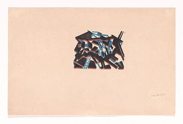 Landscape is another woodcut of industrial terrain, yet instead of jutting verticals indicating chimneys and factories, the work has a more horizontal orientation and organic quality. Bold undulating lines of color and patterns recall the work of the Russian German artist Vasily Kandinsky, which Wadsworth knew well from his time in Munich. In the first issue of BLAST, Wadsworth translated an excerpt from Kandinsky’s Concerning the Spiritual in Art in which he praised the power of "a square, a circle, a triangle, a rhombus, a trapezium, and other innumerable forms. . . . All these forms are citizens of the abstract empire with equal rights." Wadsworth produced Landscape and other woodcuts in multiple color variants (different combinations of colored inks applied to the same carved woodblocks) and also used an array of papers to produce assorted visual effects.