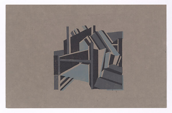 In this color woodcut, Wadsworth created a complex construction comprising layers of simplified geometric shapes. Using just three colors (gray, blue, and black) as well as the gray color of the paper, he depicted a townscape, most likely of Bradford, in the north. View of a Town is less abstract than his prior work, such as Bradford: View of a Town, in which he engaged a similar subject. Rather than using multiple interlocking lines of various sizes recalling earlier Analytic Cubist depictions of landscapes and similar motifs, in View of a Town, Wadsworth employed a vocabulary of sharp angles and larger flat planes of color. Though the work is still abstract, representational elements—such as chimneys and roofs—are visible to a greater degree than previously.