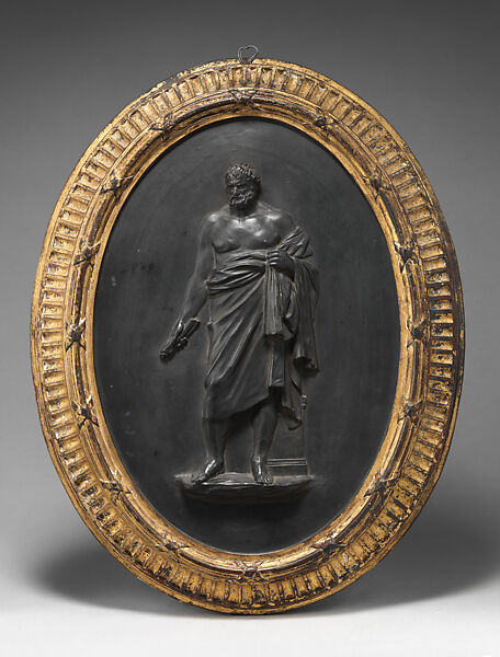 Classical themes from antiquity predominated in the decorative ceramic objects made by Wedgwood. This oval plaque depicts Zeno, the Greek philosopher from the fifth century B.C. who was best known in Plato’s Dialogues for posing a series of paradoxes to other philosophers. The molded and gilded frame is made of the same ceramic body as the plaque.