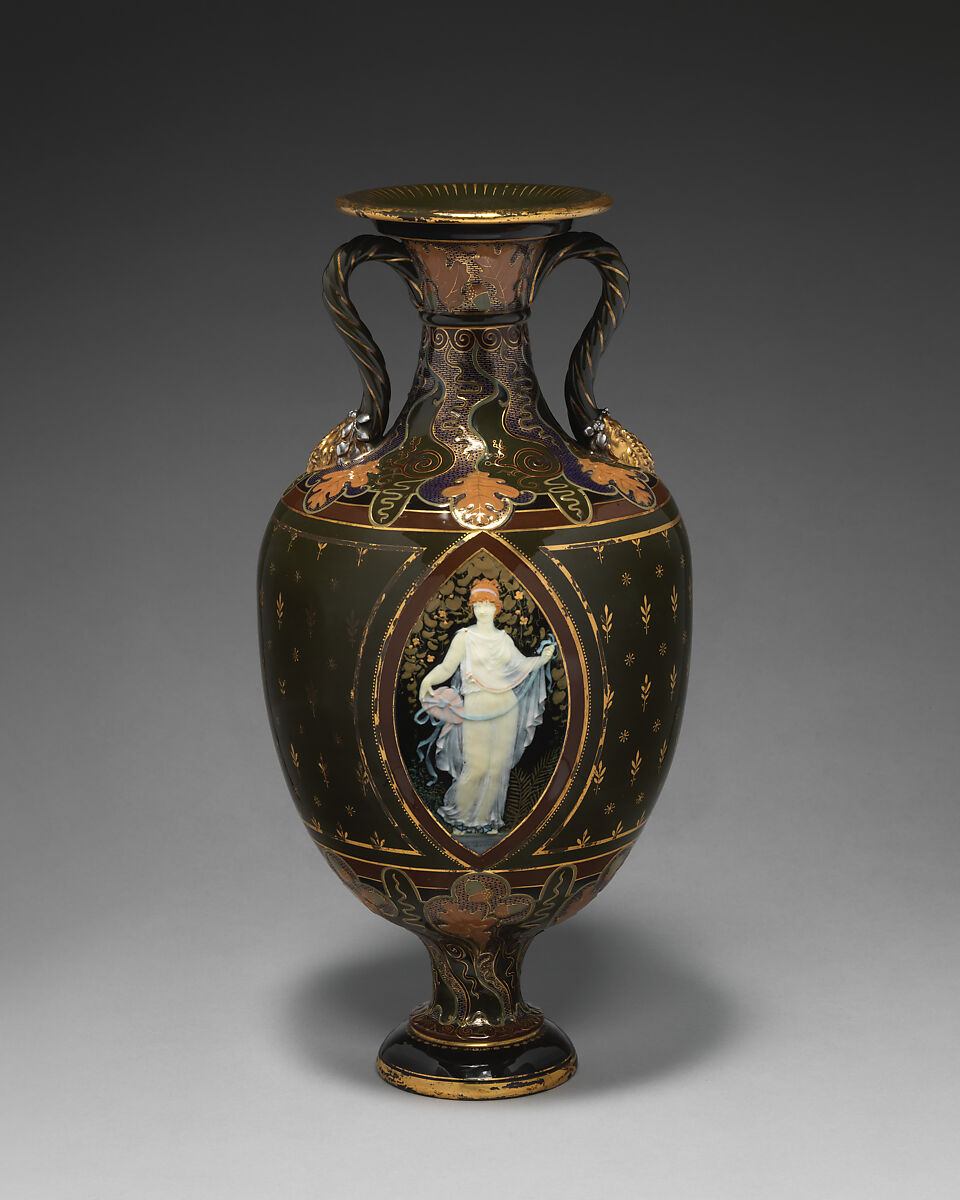Solon, a ceramic technician who initially trained at Sèvres, developed this cameo-type decoration at Minton. At the Staffordshire manufactory, Solon combined pâte-sur-pâte with rich ground colors such as the olive green seen on this vase.