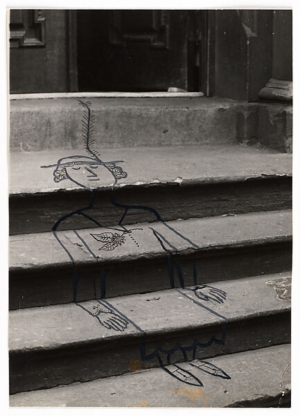 Appearing as if sketched on a city stoop, this well-dressed woman is not quite what she seems: Steinberg inked her image onto the surface of his print, stretching the limits of street photography. The illustrator took cues from graffiti while also playfully reimagining the chalk outlines found at crime scenes. Whether marking up photographs, as here, or drawing on objects that he then photographed, Steinberg effortlessly upended media hierarchies to create hybrid works of art. This piece may be an outtake from his New York–themed series for the magazine Flair, which pictured anthropomorphic office furniture and a trash bag skyline. Steinberg’s sidewalk society lady is right at home in that urban imaginary, as cartoonish as the city itself.