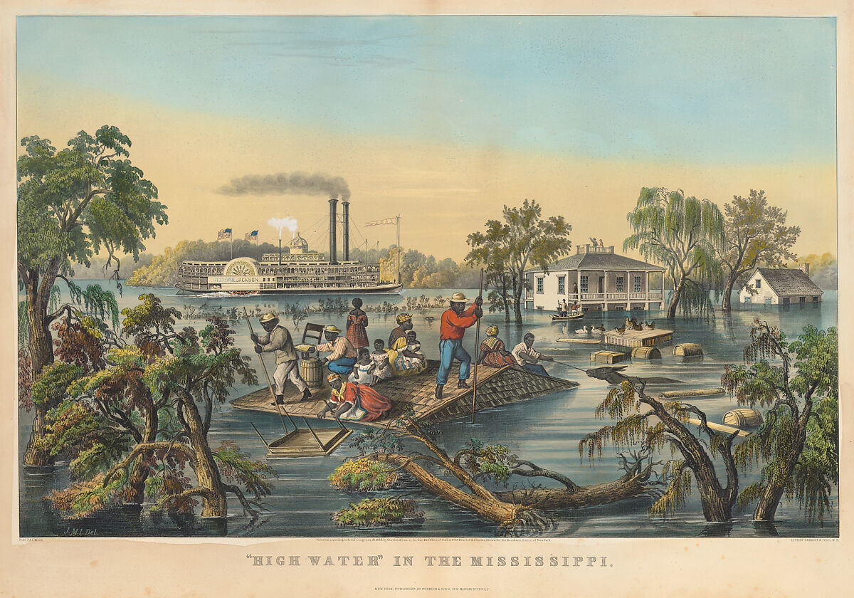 In the years immediately following the American Civil War, Currier & Ives were eager to take advantage of a new market of prospective customers, including those who wished to remember some aspects of life in the South. As residents who lived along the Mississippi River were well aware, their fields and homes were often threatened by periodic floods when river water levels overflowed its banks. This lithograph presents Black people and white people courageously coping with such a natural disaster, while in the background, the steamboat "Stonewall Jackson" (named for a Confederate general in the American Civil War who had died in 1863) progresses unhindered along the river. In the foreground of this flooded plantation scene, beyond a row of uprooted and partially submerged trees, a Black family finds precarious safety on the rooftop of a humble dwelling. While the Black mother and three children sit atop the roof's highest section, two men holding long poles and a woman try to retrieve furniture (a table and a chair) floating on the floodwater. Another man pulls the bridle of donkey swimming in the water; on the far side of the roof, a girl stands looking at the devastation. In the right background -- beyond a flooded chicken coop (with chickens on its rooftop), floating cargo containers, and two men in a rowboat-- is a grand two-story house (with the water level approaching the second story); standing at the top of the house is a white man (waving to signal for help) and a woman. Recent scholars have provided varying insights into the complexities revealed by such images. Some interpreted this as a poignant image of recently freed enslaved people struggling to survive in a devastated South, yet the white residents retained the "higher ground" literally and figuratively.