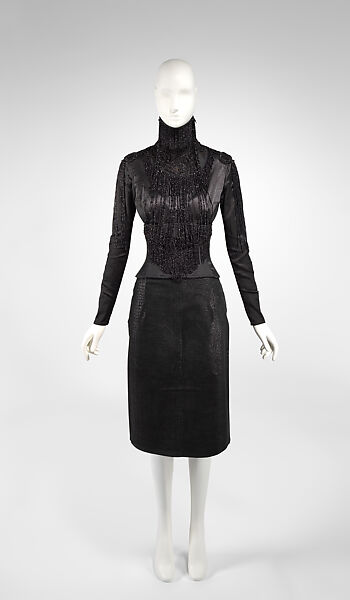 Olivier Theyskens looks at historical objects with childlike wonder, reinterpreting them with a romantic sensibility into today's fashion vernacular. For this early piece, he reused antique jet beads he found at a flea market to create a handmade boned bodice and neck piece with fringes of jet beads. Jet beads were typically used for mourning jewelry and attire in the nineteenth century, and whilst resplendent, they also evoke the melancholy spirit underlying most of Theyskens' creations: "In my work, there is an awareness of beauty, a meeting between strength and fragility, that something is a little broken. I like to show the ambiguities and ambivalences of the emotions, to play that string."