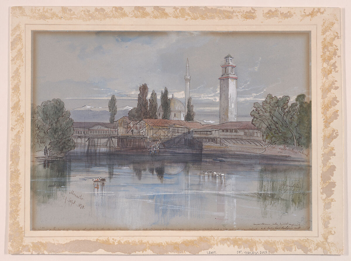 Lear visited Monastir during a fall 1848 tour. His "Journals of a Landcape Painter in Albania, etc." (1851) record Constantinople as his point of departure, and arrival at Monastir on September 18th, with a stay of three days. Then part of the Ottoman Empire, the town lies in a region that borders Illyria and Macedonia and is today known as Bitola, within the Republic of Macedonia. In the mid-nineteenth century local Muslims regarded drawing as blasphemous and made it impossible initially for Lear to sketch outdoors. After visiting a local Ottoman official, the Cambridge eduated Emim Seraskier Pasha, he received a guard and was able to work unmolested. This view along the Dragor River includes a prominent tower at right (repurposed today into a clock tower), with the dome and minaret of the Jeni Mosque visible through trees. In the distance, Lear included a bridge lined with shops, noting in his journal that, "either looking up or down the river, the intermixture of minarets and mosques with cypress and willow foliage, forms subjects of the most admirable beauty...How picturesque were those parts of the crowded city in the Jews' quarter, where the elaborately detailed wooden houses overhung the torrent, shaded by grand plane, cypress, and poplar!" White-capped mountains may be seen in the distance.