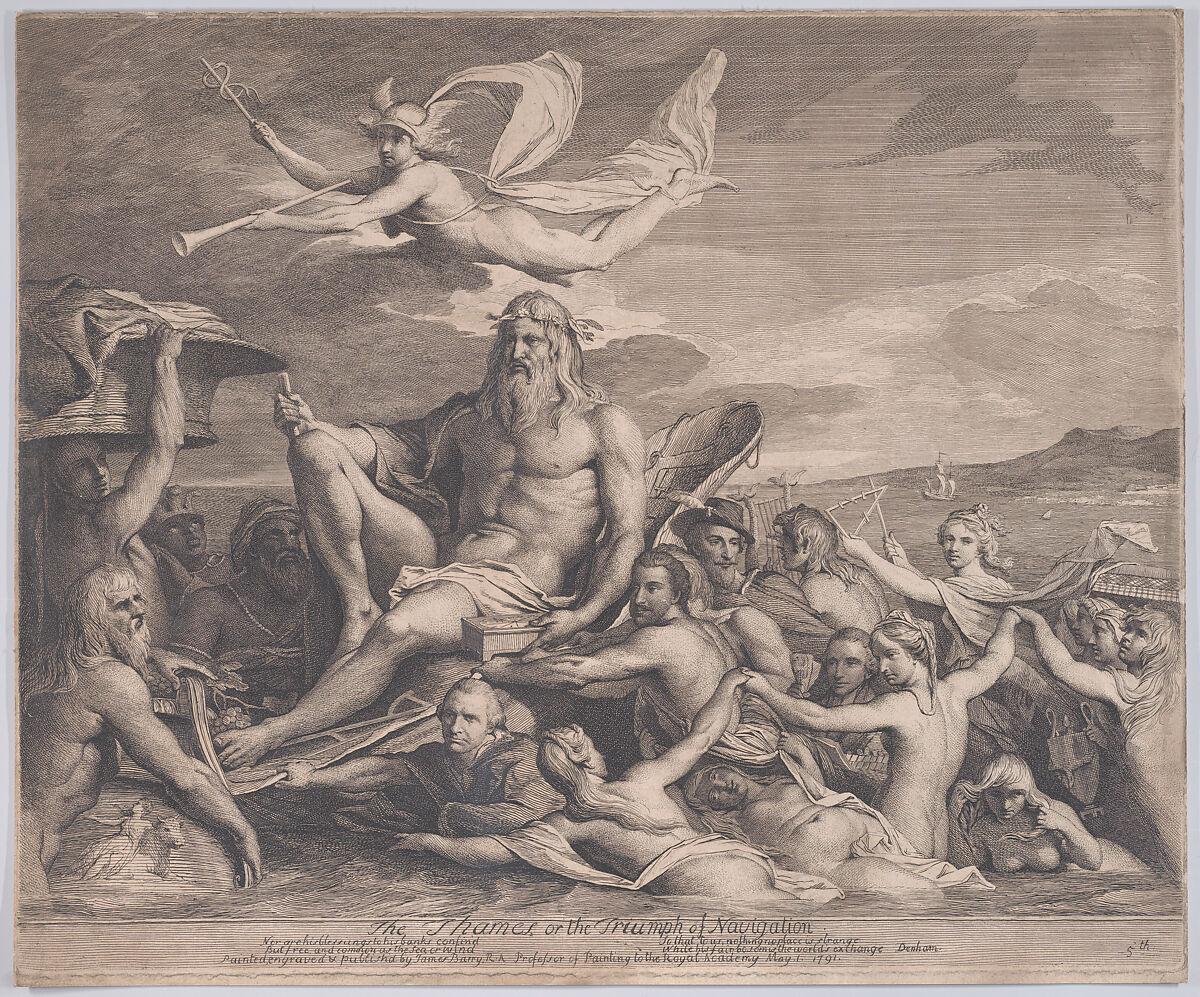 Barry based this print on one of the paintings he made to adorn the Great Room of London's Society for the Encouragement of Arts, Manufactures, and Commerce. The image centers on a personification of the Thames who rides in a vessel that moves away from the English coast as Mercury, the god of Commerce, flies overhead. Modern figures and objects elaborate the allegory, with navigational instruments invented or improved by Englishmen guiding the Thames, who is propelled by the illustrious seamen Sir Walter Raleigh, Sir Francis Drake and Captain James Cook. Nereids swim alongside carrying the manufactures of the Midlands, to be dispersed to the four principal trading continents. In typical individualistic fashion, Barry inserted a portrait of his friend the musician Dr. Charles Burney amidst the nereids, to remind viewers of the need for a national school of music. The first state of this work was printed and published by Barry in 1792; this example of the third state dates to 1801-2 and is identified by the addition of a naval tower at right.