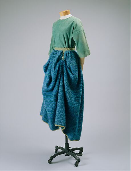 The wearer is ready for day or evening in this elegant ensemble. As rustic, tactile, and colorful as Cashin's favored mohair is, this outfit works chiefly in terms of silhouette. The profusion of skirt materials can be pulled up and even stuffed into pockets ("retroussée dans les poches") to create a look reminiscent of late eighteen-century fashion. The Cashin silhouette, however, is more simply achieved with an unusual skirt fastener. She called this favorite device her "dog leash" in recognition of that simple hardware. The effect is to winch up the cloth and make the mohair more layered and luxurious by a profoundly simple hitch. A suede bodice, a surprising element for evening, provides a luxurious contrast as well.