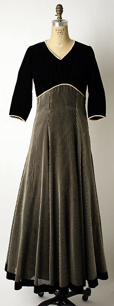 For the soignée Muriel King, a dinner dress could take on the effect of separates, even emulating a nineteenth-century military spencer at the high-waisted curve of the waistline. The lower portion of the dress with its striped fabric appears to be a separate underdress, reflecting the casual ethos of sportswear like so many other fresh stripes of the 1930s and 1940s.