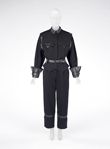 This tailored jumpsuit embodies several of Claude Montana’s design strengths: his able manipulation of heavy materials like wool and leather, his interest in exaggeration as exemplified through the tightly cinched waistline, and his appropriation of elements from fetish wear as seen in the cuff details that evoke wrist restraints. Though Montana was active for a relatively brief period, from the late 1970s through the early 1990s, his impact on fashion has been significant and enduring. This look was part of his autumn/winter 1983-84 collection, presented only a few years after the founding of his namesake label, The House of Montana, in 1979.