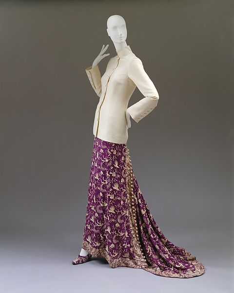 In this ensemble, Gaultier combines high, midcentury French style with imagery from the Far East. His Nehru jacket recalls Christian Dior's New Look "Bar" jacket, and is lavishly embroidered skirt cites the exoticism of early-twentieth century Chinese export shawls. Less obviously, the skirt's construction refers to similar garments of the 1890s.