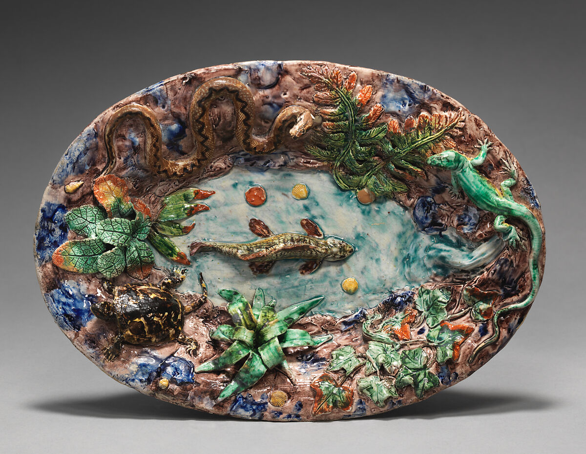 Joseph Landais had close ties to the family of Charles-Jean Avisseau, who was credited with rediscovering the techniques of Palissy in the nineteenth century. After marrying Avisseau’s sister, Landais set up a workshop with Avisseau in Tours in 1843, only to end their joint enterprise three months later and establish rival firms. Like his brother-in-law, Landais based his career producing works inspired by Palissy, such as the example here showing a fish in the center of a fertile pond.