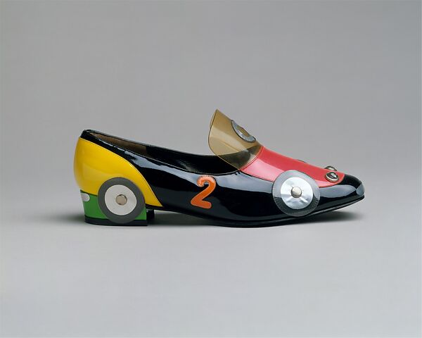 The increasingly common use of plastics for footwear in the 1960s allowed the designer free rein for whimsical interpretation. This shoe, made of clear, colored and mirrored vinyl shapes, and trimmed with molded plastic "headlights," is designed to look like a race car, complete with numeric designation and "windshield" upper. The bright colors of the shoe fit the Pop Art and Space Age aesthetic of the 1960s, also apparent in garments designed by Rudi Gernreich (19221985) and André Courrèges (born 1923).