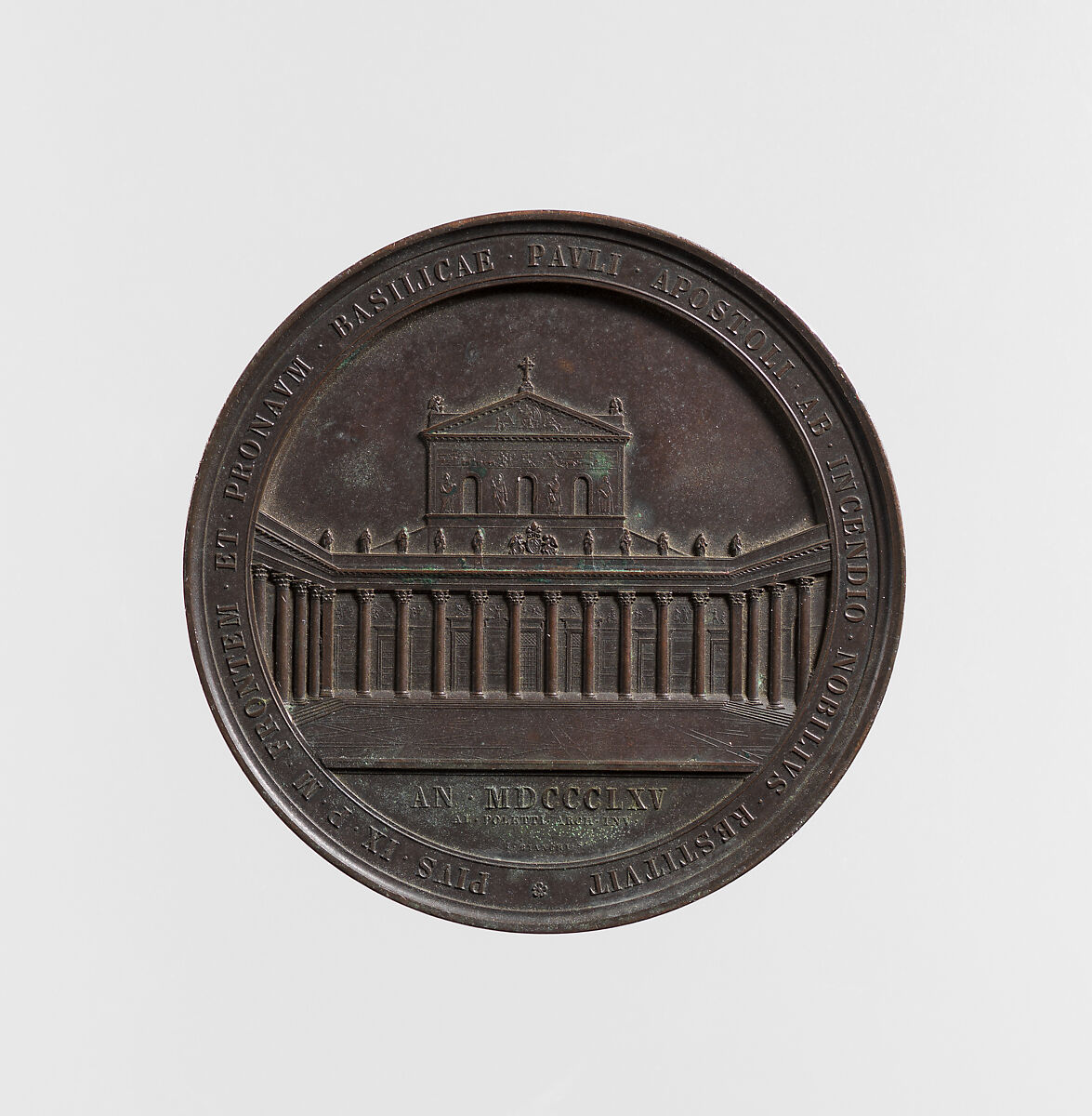 In 1823, fire devastated Saint Paul Outside the Walls, one of the four ancient papal basilicas in Rome. Pope Pius IX (1792-1878; reigned 1846-1878) took on the immense decades-long task of rebuilding the structure. In 1854, Pius issued an annual pontifical medal commemorating the re-consecration of Saint Paul’s high altar in which the pope’s profile portrait was depicted on the front (obverse) and a view of the basilica’s interior on the back (reverse). In 1865, another pontifical portrait medal celebrating the ongoing reconstruction of the basilica’s exterior included a reverse illustrating a view of its façade and its portico entrance and courtyard colonnade. In 1865, these architectural scenes were combined into a single medal of which this is an example.