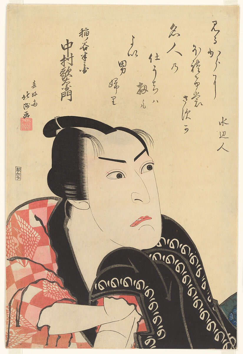 One of the great “all-around actors” (kaneru yakusha) of the Osaka stage who could play any type of role—male or female, hero or villain—Nakamura Utaemon III (1778–1838) is captured in a dramatic bust portrait of the townsman turned samurai Inanoya Hanbē. The accompanying poem, probably by a member of a fan club, praises the actor: