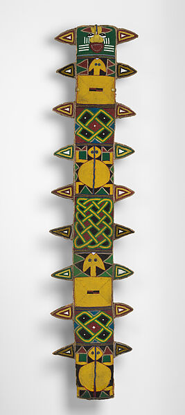 The signature emblem of Oko, the òrìṣà (deity) of agriculture, is a staff forged by a blacksmith from worn farming implements. Petitions for healing, justice, prosperity, and safe childbirth are directed toward that insignia through the medium of a priestess. Forbidden from touching the ground, the staff would be set inside an open calabash and fed harvested yam, kola nuts, and other offerings. This genre of beaded sheath was used to clothe the staff when it was ritually inactive. Though not a king in life, Oko is frequently honored through visual references to birds, crowns, and other attributes of authority. Triangular flaps affixed along the perimeter of these sheaths signal the presence of the divine, while knot-like motifs composed of interwoven lines evoke the eternal cycle of life, death, and rebirth.