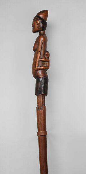 The emergence of a powerful, centralized Zulu state in the early 19th century, as well as the bravery demonstrated by its warriors in the 1879 Anglo–Zulu War, generated global interest in and demand for Zulu cultural artifacts. While Zulu patrons favored geometric and abstract designs, Europeans gravitated to figural works. To capture this new market, Tsonga sculptors adapted their tradition of freestanding figure carving to walking staff finials featuring Zulu subjects. In the example here, that crowning element takes the form of a regal female figure wearing the conical hairstyle of a married Zulu woman, an infant nestling against her back. It is one of at least a dozen finely carved staffs that have been attributed to an itinerant Tsonga carver active across the urban centers of colonial Natal. Although baboon depictions are one of his most distinctive subjects, he also likely produced mother-and-child finials as well as single male and female ones. Those elegantly attenuated figures were finished with delicately carved, low-relief features. By the end of the nineteenth century, this carver appears to have established a workshop of apprentices, including his own son. Carvers of his generation made works to sell to their local communities while also marketing them as widely as possible. His clientele ranged from powerful chiefs to travelers, colonists, and missionaries.