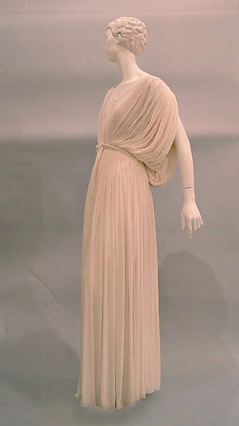Madame Grès, a designer popularly associated with a Neoclassical sensibility, has created a gown that appears to conform to the structure of the classical chiton. She was, however, inventive in her technique while conforming to an ancient aesthetic. Her gown is composed of two continuous panels of fabric, seamed only at center front, back, and sides. Lines of stitching at the shoulders and waistline hold in the finely gathered drape and a flesh-toned chiffon lining raises the waist to form the kolpos, or blouson.