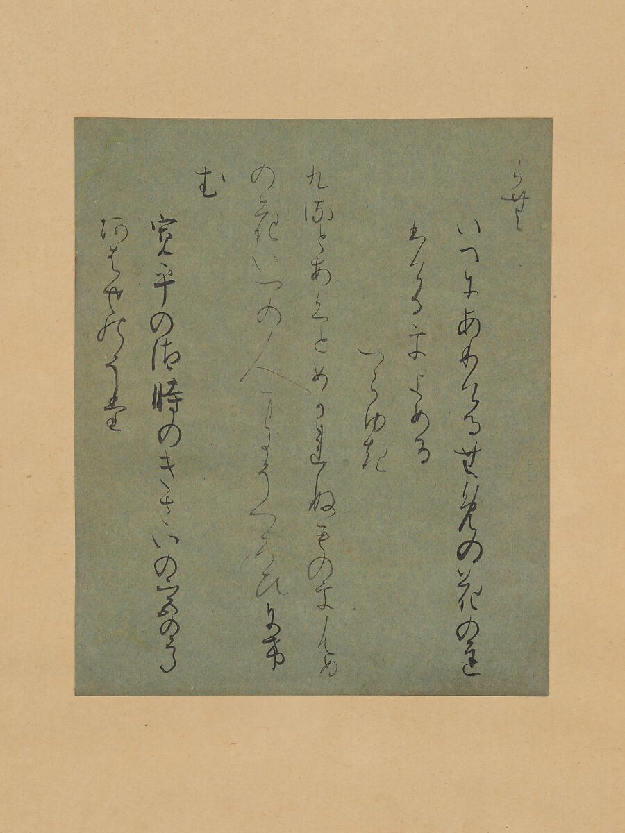 A thirty-one-syllable poem on early spring appears inscribed on blue-dyed paper in an elegant, flowing script—mostly kana. It is from the Collection of Poems Ancient and Modern (Kokin wakashū), the first imperially commissioned anthology of waka, compiled around 905 by the courtier-poet Ki no Tsurayuki. This page, remounted as a hanging scroll, was once bound into an edition known as the Sekido-bon, with pages dyed various colors. The poem reads: