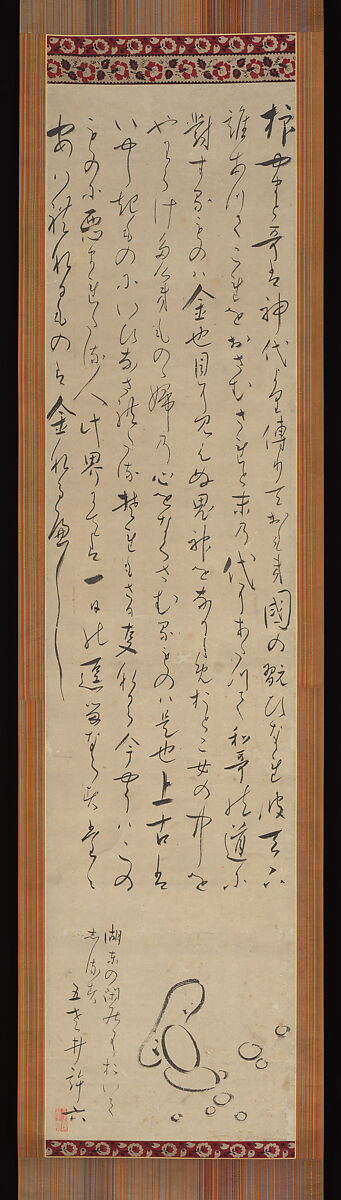 This hanging scroll records reflections on Japanese poetry by Morikawa Kyoriku, a samurai of the Hikone clan who was also a noted poet of haikai (seventeen-syllable verse) in the style of Matsu Bashō, and recognized as one of the master’s ten top pupils. The celebrated poet-calligrapher brushed seven columns of highly cursive, somewhat idiosyncratic, but eminently legible characters—mostly kana (Japanese phonetic writing) with an admixture of kanji (Chinese characters) that punctuate the composition with slightly denser forms. For instance, at the bottom of the second column from the right, we see the characters waka no michi 和哥の道, or the “way of Japanese poetry,” are melded into a column of mostly kana. And as we scan the text elsewhere for easily recognizable phrases, we realize that this is a prose commentary not on haikai, as we would expect, but on waka (courtly verse in thirty-one syllables) and the status of Japanese poetry in general.