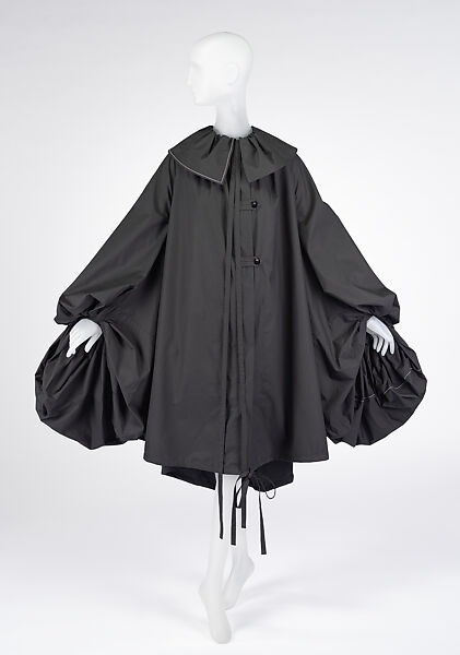 This parachute coat by Jonathan Anderson was designed for the storied house of Loewe, a Spanish purveyor of leather luxury goods that was founded in the nineteenth century. By 1945 the house had expanded to include clothing, and in 2013 Jonathan Anderson assumed creative direction of the brand. Anderson’s spring/summer 2020 collection for Loewe was inspired by historical craft and the precision found in the construction of 16th and 17th century garments. This parachute coat borrows heavily from the period, notably through billowing sleeves that conjure garments such as the cuculla, a choir robe associated with the Cistercian order of monks, and the oversized collar of the Pierrot, a mime-type stock character of the Commedia dell’arte and Comédie-Italienne.