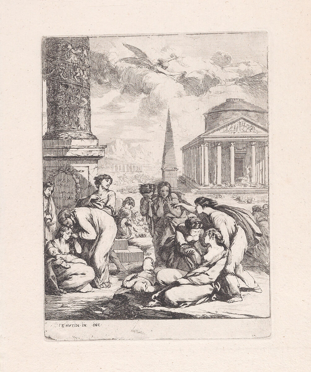 This print is from a series depicting The Seven Mercies made by François Hutin presumably during his stay in Rome, from 1737 to 1742. His facility with the etching needle is evident in the expressive forms of the figures and the mastery of light effects. After his death, his son would claim them as his own work, altering the first initial in the signature from "F" to "C" when he published a collection of his etchings in Dresden in 1763.