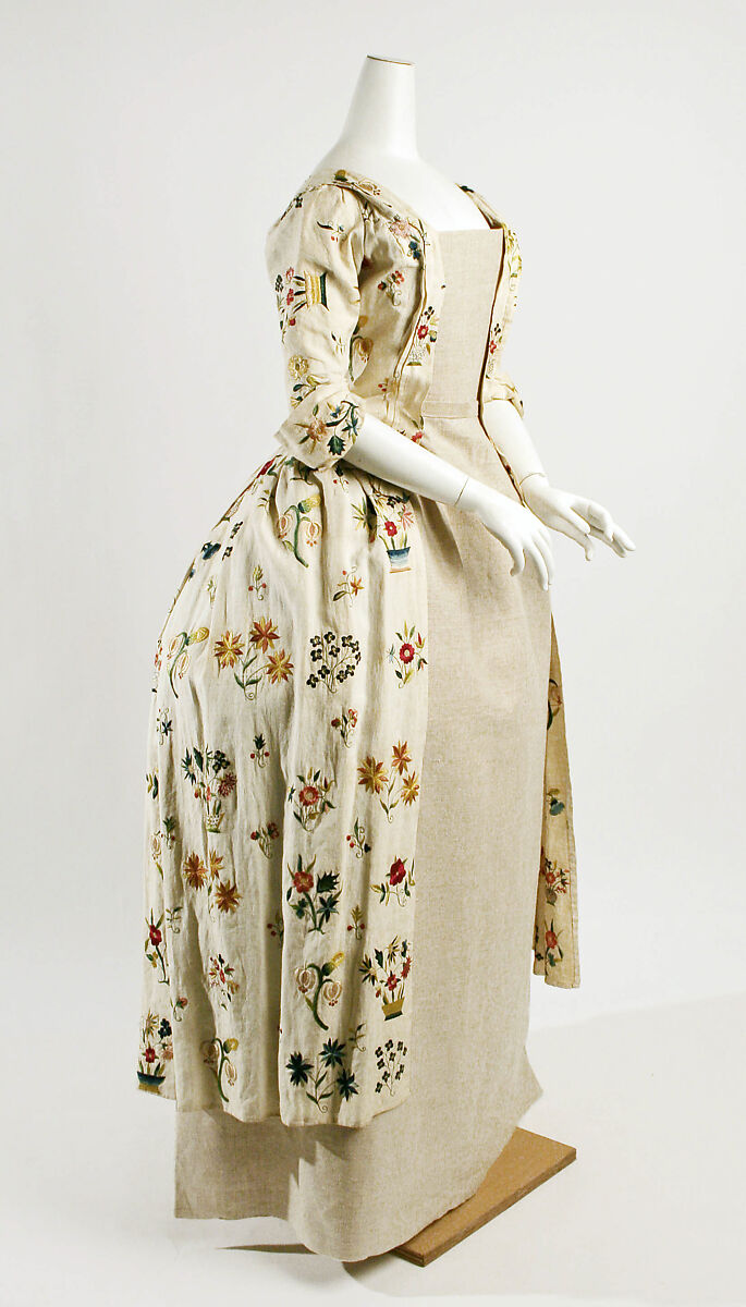 Linen gowns, plain versions of contemporary dress, were popular with gentlewomen for morning wear in the English countryside. These gowns were very sensible, as they could be laundered often and still retain a fresh appearance. They were often decorated with embroidery, usually stitched by the wearer herself. Embroidery was considered a gentle, feminine occupation for ladies of all classes of society. The lively floral embroidery on this day dress was probably done from a ready-made pattern, although the embroiderer has individualized the floral bouquets.