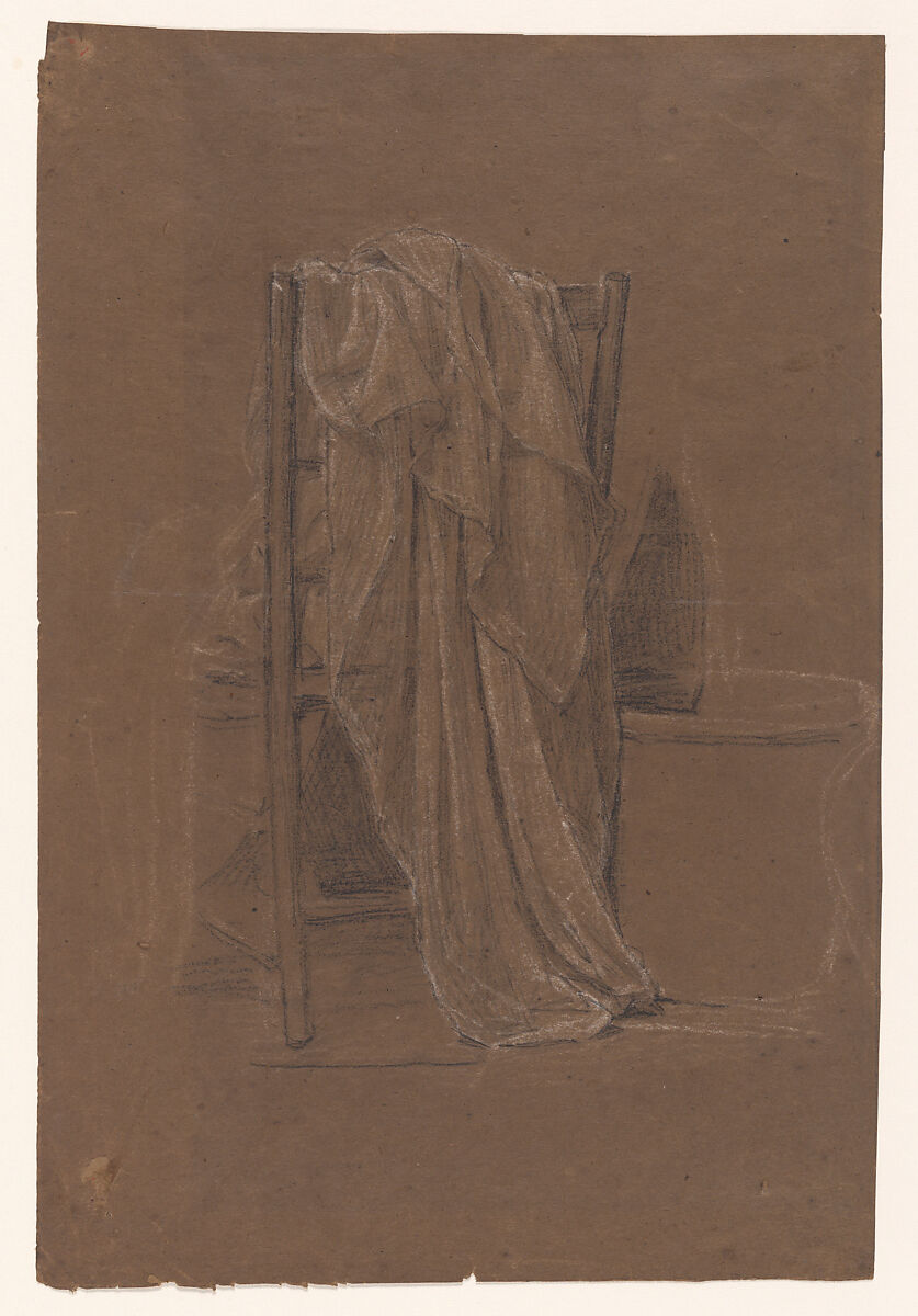 This sensitive study of semi-translucent drapery falling over the back of a chair relates to Moore's painting "A Venus" (1869; York Art Gallery). In the latter, a similar arrangement appears at left placed next to an idealized nude woman who stands before flowering branches and next to two vases. The artist was a leader of the Aesthetic Movement whose proponents believed subject matter to be less important than beautifully arranged forms and harmonious colors. When preparing a composition, Moore made studies of figures, draperies and details which reveal how his ideas developed. His choice of rough brown paper to serve a support for studies was taken up by James McNeill Whistler who used it for pastel drawings.