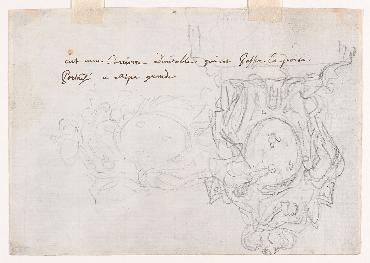 This sheet was made by the French sculptor Augustin Pajou while he was a pensionnaire at the French Academy in Rome between 1752 and 1756. On the recto, he sketched (or copied?) a rocky landscape with figures. On the verso, he sketched two quick designs for a cartouche with the king’s arms intended for the façade of the Palazzo Mancini in Rome, home of the French Academy. The cartouche, commissioned in 1753, was never realized.