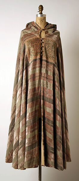 Fortuny's artist-father created with access to an aficionado's collection of diverse historicist and exotic objects. He collected North-African textiles and costume and used them as studio props. The younger Fortuny continued the life of such objects in what he characterized as his inventions, a science applied to dress. This evening wrap is almost literally a berber cape, except for the specific textile (silk velvet) and embellishments (metallic stenciling) typical of Fortuny.