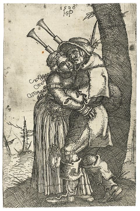 This etching demonstrates the freedom of the new printmaking technique; and, despite the familiar subject in Beham's oeuvre of a couple dancing, this small-scale work in some ways shows Sebald at his most inspired. The sexual reference of the bagpipe seen here was firmly based in sixteenth-century folklore, but the spontaneity of the couple's embrace is emphasized by the lack of inscription or moralising undertone which appeared in his later works.