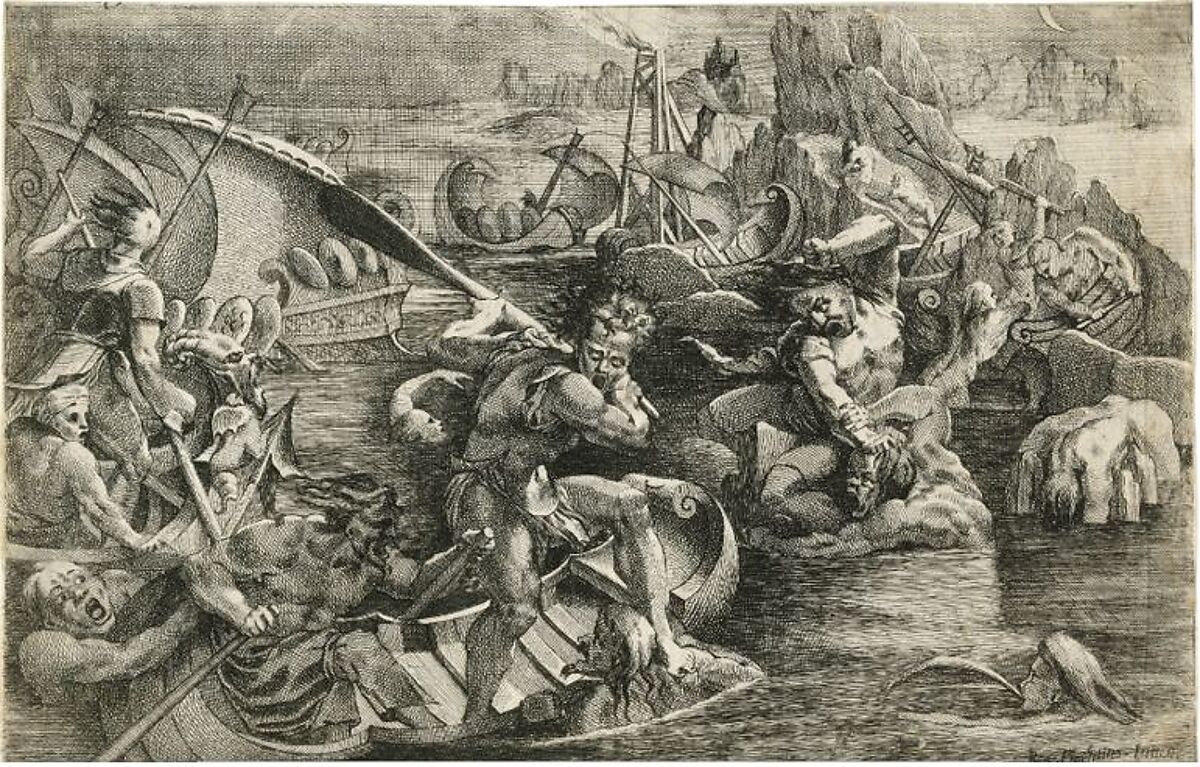 The print depicts the dramatic revenge of Nauplios after Rosso Fiorentino’s fresco on the north side of the Galerie François I in the Palace of Fontainbleau, south of Paris. Avenging the unjust killing of Palamedes, Nauplios caused the Greek fleet that was sailing home from the Trojan War to shipwreck. The fresco dates from 1535–37, and in the decades shortly after it was completed printmakers reproduced it in print; Antonio Fantuzzi for example produced an etching around 1542–47 (see 49.50.220). Fantuzzi’s print shows several differences when compared to the painting; for example, he includes rocks in the foreground. Garnier’s print however faithfully follows the original without embellishment.