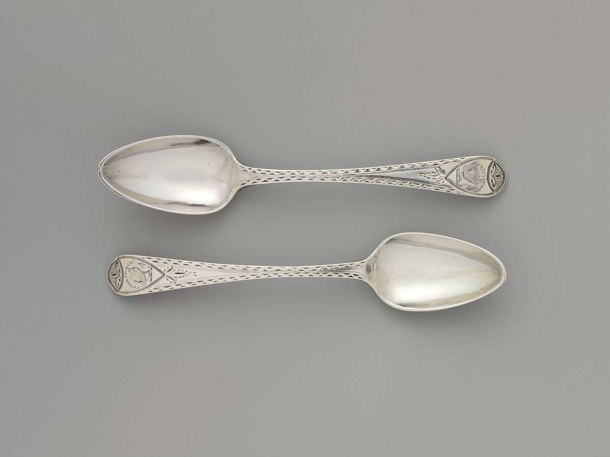 This teaspoon bears the crest of the Verplanck family, with their motto, which is translated: As in life so in death. It was probably the property of Gulien Verplanck, the son of Gulien and Mary Crommelin Verplanck.