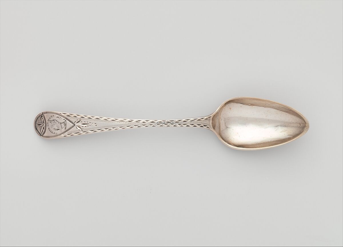 This teaspoon bears the crest of the Verplanck family, with their motto, which is translated: As in life so in death. It was probably the property of Gulien Verplanck, the son of Gulien and Mary Crommelin Verplanck.