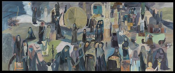 Joseph lives and works in the historic multicultural neighborhood of Mattancherry in Fort Kochi, India. Against this vibrant backdrop she set this dreamlike composition of predominantly Muslim women—identified by their dress—going about their everyday routines. This work and two other paintings that depict the lives of women in Mattancherry are titled after Paul Gauguin’s famous painting Where Do We Come From? What Are We? Where Are We Going? (1897–98; Museum of Fine Arts, Boston). Unlike Gauguin’s colonialist approach toward Tahitian women, Joseph’s examination of her subjects’ interior lives is more sympathetic. "I set out to do a study of women’s lives around me, while being preoccupied about the ‘meaning of women’s lives,’" she has said. "Are women not anything more than means to make men’s lives easier while they go on their quest to make their own lives meaningful?" The existential quandary of this work’s title, What Are We?, may be the query these women ask of themselves and the gendered roles they navigate.