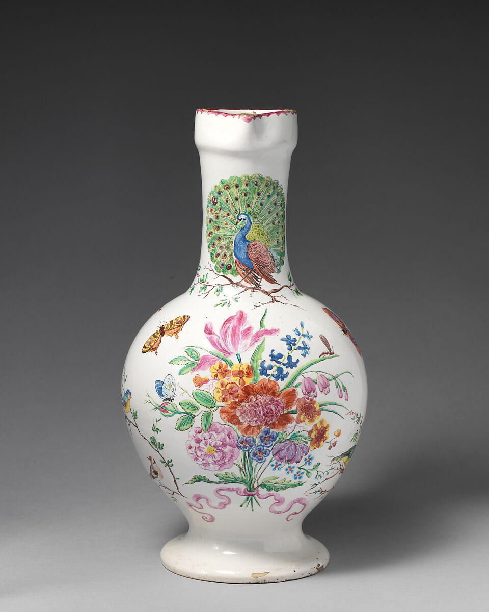 An independent decorator based in Augsburg, Seuter’s work indicates the trend towards naturalistic motifs that would characterize later examples of eighteenth-century tin-glazed earthenware in Germany. Seuter in fact worked as a porcelain painter at Meissen, alongside his activities as a goldsmith, silk dyer and copper engraver. The floral designs and peacock found on this jug are characteristic motifs of the early eighteenth century, elaborate designs that enliven the quotidian form of the Enghalskrüge, a type of narrow-necked jug favored by Seuter.