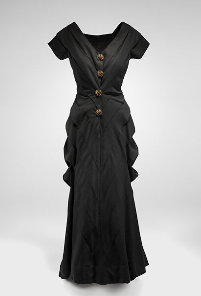 In contrast to the dinner suit's hard, masculine elegance, evening dresses of the mid- to late-1930s were softer and more feminine. Perhaps as a response to the reality of war, designers cast a nostalgic look to past styles. Particular interest was focused on the period 1850-1900, a time of relative stability in French politics and society. Designers translated styles from this period into ultra-romantic evening gowns intended to make women's figures elegantly voluptuous. Inspired by the silhouettes of the 1870s and 1880s, Vionnet, Balenciaga and Schiaparelli created dresses with bustles. Unlike the bustles from these periods, however, their fullness was achieved not through wiring or boning, but by the fabric alone.