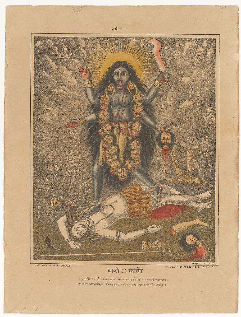 Kali, the supreme embodiment of female power (shakti), is a manifestation of the goddess Parvati, Shiva’s loving wife, and is particularly worshipped in Bengal as the premier goddess of the sakta cult. Her vengeful and blooded form came to embody all that Europeans in India came to most fear—and misunderstand—in Hindu society. Kali embodies power over time and is often described as the Destroyer of Time, embodying the natural forces of destruction. She is typically represented standing on the prostrate figure of her husband, Shiva, who here is seen lying in a charnel ground, his trident and drum abandoned. Ghostly images of the dead and their tormentors emerge from the smokey mists. The male gods Brahma and Vishnu appear in the billowing clouds as witnesses to the goddess’s display of supreme power. Kali, youthful and beautiful, wields a bloodied cusp-bladed sword designed for the decapitation of sacrificial buffalo. She is here adorned with the human heads severed from their bodies and strung into a grotesque garland. She holds a freshly severed head in her lower hand. The goddess is four armed, and the palm of each hand is stained red from her bloody work. Female devotees stain their hands with henna today to achieve this effect. Kali’s apron is composed of severed arms, her ears are adorned with corpses that serve as macabre ornaments. A forehead eye signals her omnipresence and a lolling red tongue her fearful countenance.