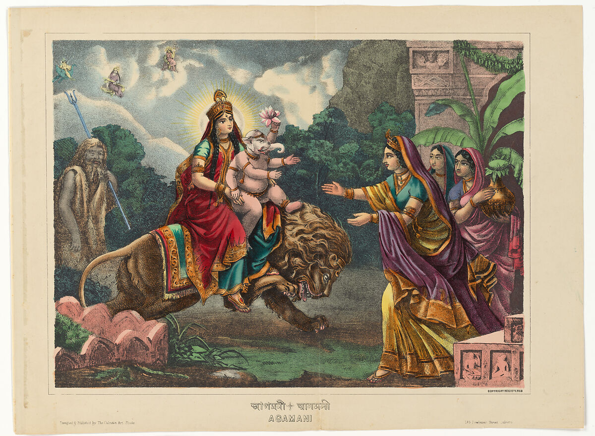 Agamani-vijaya is a genre of popular Bengali (Bangla) song based on the stories of Shiva and Parvati and particularly favored for singing during the Durga puja festival season in the autumn. The songs tell of Parvati, the daughter of the king of the Himalayas, who marries Shiva, seemingly a yogic ascetic with no visible means of support. Parvati’s mother Menace sought Shiva’s permission for her daughter to have a visit to her parental home. The songs composed about her homecoming are known as Agamani songs. Here we see the beautiful and regal Parvati returning home on her lion, cradling the infant Ganesha. Her mother and maid servants Jaya and Vijaya rush forward to greet them. Parvati’s eldest son Skanda appears in the heavenly clouds astride his peacock accompanied by the goddesses Sarasvati and Lakshmi, bearing witness to this joyous reunion. In Bengali culture these goddesses are often considered Parvati-Durga’s children. Nandi, a bearded ascetic carrying a trident (trisula), has accompanied Parvati and Ganesha on their journey. He is the guardian of Shiva’s abode in the Shaiva Siddhanta tradition and alongside the calf-bull Vrsabha, his highest devotee. In the north Indian and Bengal tradition, a new bride departs from her family and enters into that of their husband. Such homecomings, especially when presenting a newborn grandchild, were occasions for much celebration.