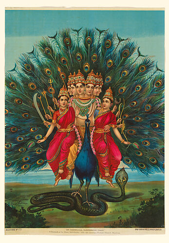 Vishnu aroused from his slumber on the divine serpent is one of the great creation myths of Brahmanism. Here, the artist has reinvented the narrative, displaying Vishnu seated regally alongside his two consorts, Lakshmi and Bhudevi, on the coiled snake’s golden body; its multiple heads form a royal parasol. The divine ensemble is depicted as youthful, beautiful, and bejeweled. Vishnu holds his four insignia—discus, conch, club and lotus—and gazes intently upon his devotees, while his consorts have eyes only for him. The work’s title, Shesh Narayana, combines the name of the serpent (Shesha) and an epithet of Vishnu (Narayana). The heightened realism seen here consolidated Ravi Varma’s position as the leading artist of religious prints in the early twentieth century.