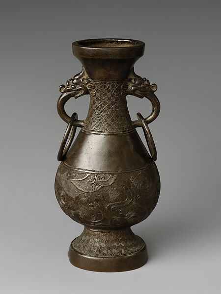 This work of art is currently on loan to the museum.This finely cast vase exemplifies how ancient bronze designs were creatively reinterpreted in the fourteenth century. The dense patterns of square and hexagonal spirals encircling its neck and foot and surging waves encircling the belly are new inventions that have replaced archaic-style motifs, such as animal masks.