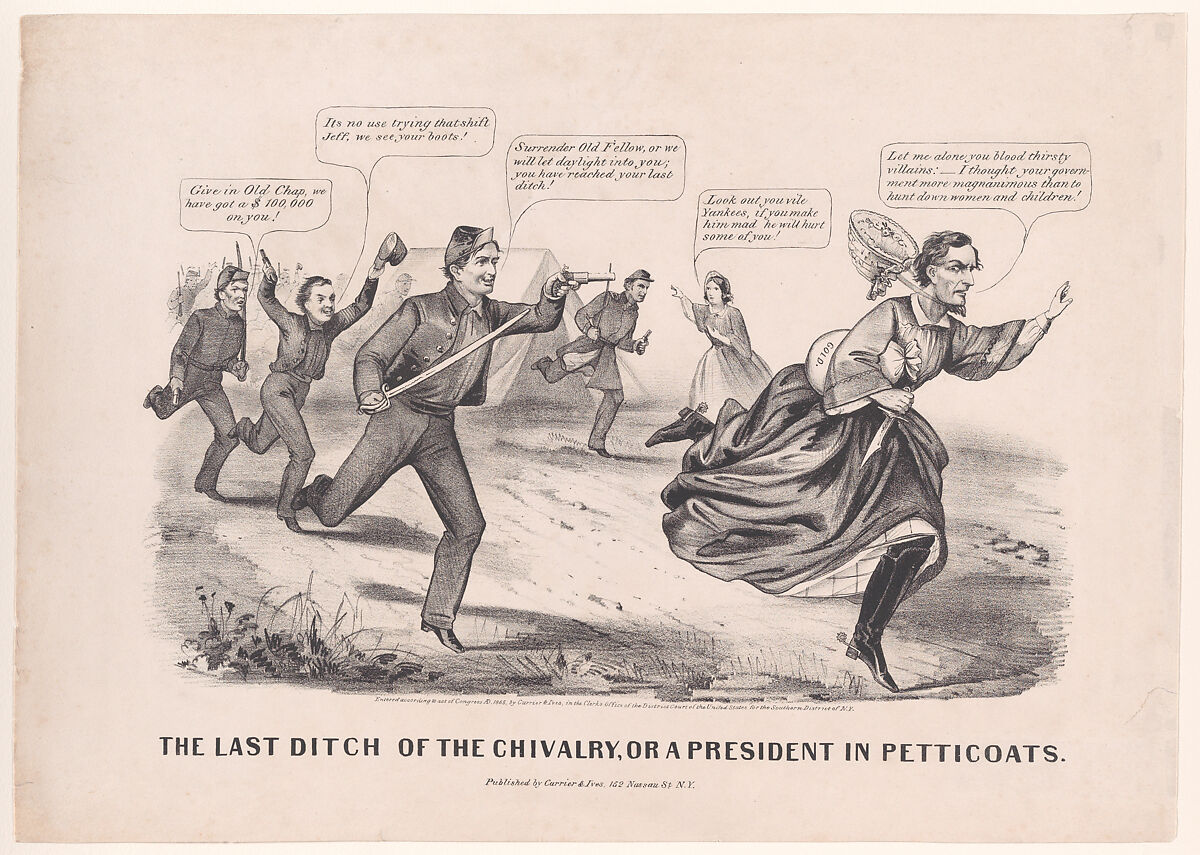 During the closing days of the American Civil War Northern satirists often showed the defeated Confederate President Jefferson Davis trying to slip through enemy lines wearing women's clothing. After Robert E. Lee surrended on April 9, 1865, Davis evaded capture for a month, pursued by Union troops who believed he had plotted the assassination of President Lincoln. On May 10th he was finally arrested in Georgia wearing his wife's overcoat, thrown on as he rushed out of the house. Northern tabloids embellished this detail to described Davis in a dress, inspiring prints like this one. Challenge Southern claims of gallantry and chivarly, the image echoes a popular song titled "Jeff in Petticoats." Here, the subject carries a bag of gold as he runs from Union soliders who have recognized their quarry by his boots. Standing to one side, Davis's wife warns the soldiers not to make her husband angry.
