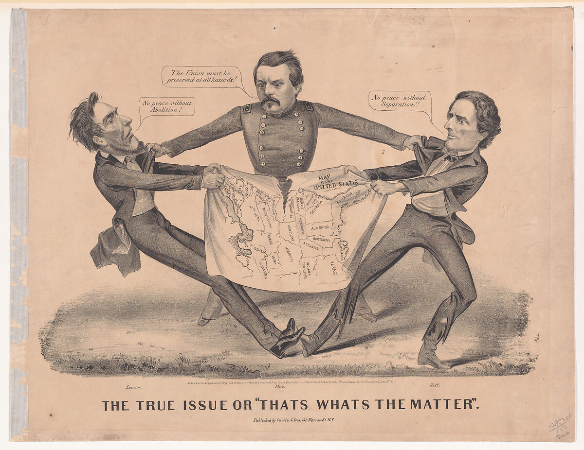 Throughout the Civil War, Currier & Ives issued biting political satires. Here, Abraham Lincoln and Jefferson Davis, presidents of the United States and the Confederacy, struggle to control a map of the eastern United States that has started to rip from east to west. General George McClellan, Lincoln’s opponent in the presidential campaign of 1864, stands between the contenders and declares that the Union must be preserved at all costs. Lincoln counters, "No peace without abolition!!" while Davis insists, "No peace without separation!!" The image encapsulates the chief political positions presented to Union voters in 1864 as well as the Confederacy’s official position on the war.
