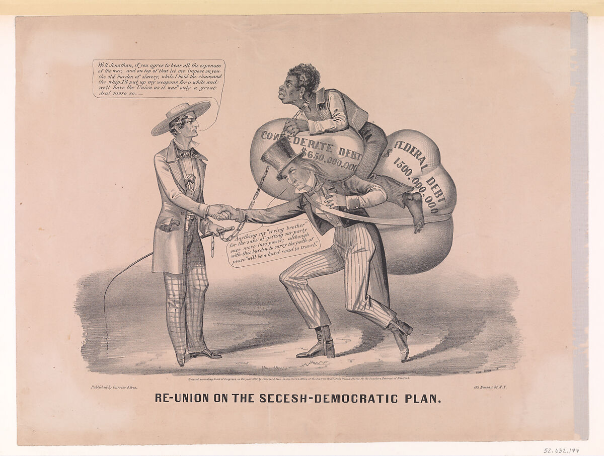 Made early in the American Civil War, this political satire responds cynically to efforts by the Democratic party to pursue a negotiated end to Southern secession. Shown at left, dressed as a Southern Planter, Jefferson Davis, the President of the Confederacy carries pistols, a whip and chain attached to an enslaved Black man. At right is Brother Jonathan, a personification of America that pre-dated Uncle Sam, staggers under a huge bundle labeled "Confederate Debt $650,000,000" and "Federal Debt $1500,000,000," as well as the Black man chained by Davis.The latter says, "Well Jonathan, if you agree to bear all the expenses of the war, and on top of that let me impose on you the old burden of slavery, while I hold the chain and the whip, I'll put up my weapons for a while and we'll have the 'Union as it was' only a great deal more so."