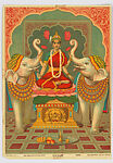 Lakshmi, the goddess of wealth and happiness, fertility, and prosperity, being lustrated by celestial elephants. Honoring her dual role as Vishnu’s consort, she is here represented with four arms, enthroned on a lotus in a contemporary setting.