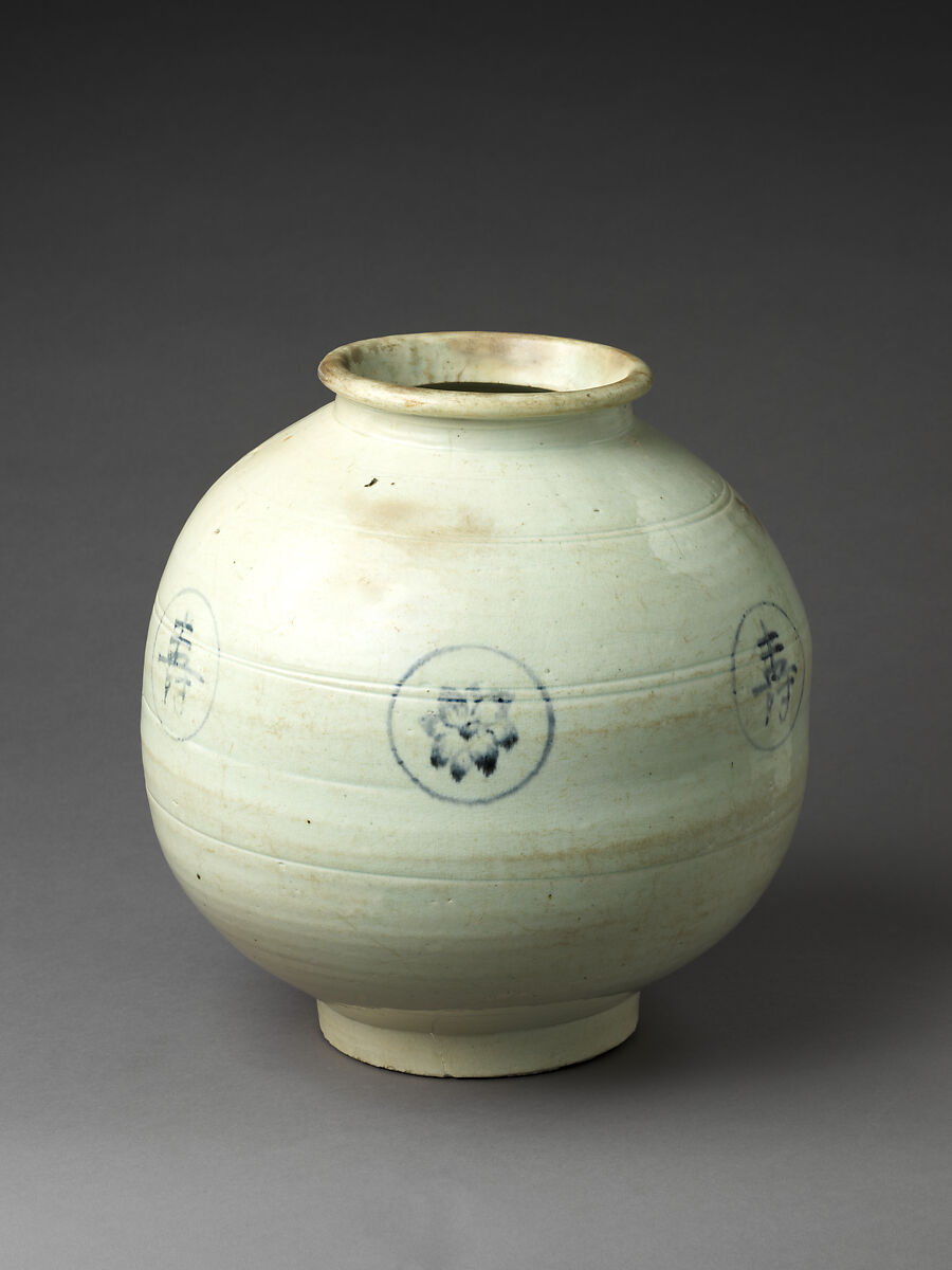 Resembling a moon jar in shape and production method, this vessel is similarly formed by fusing two hemispheres. While its size and asymmetry exude the same unaffected charm that has made moon jars national icons, it is distinguished by its surface decoration. Cobalt-blue roundels with alternating floral and calligraphic motifs appear slightly above the central seam. The characters convey auspicious wishes for longevity (壽, su) and blessings (福, bok). The cobalt-blue reflects the popularity of blue-and-white porcelain in the nineteenth century. Purportedly collected by the Japanese potter Shimaoka Tatsuzo (1919–2007), jars like this played a part in the development of Japanese mingei aesthetics and philosophy, which celebrated everyday objects made by ordinary people.