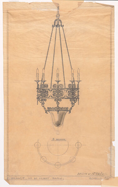 Elevation and plan for a chandelier, made by the Parisian firm of Edgar Brandt. The design is part of a group of fourteen drawings on transfer paper containing presentation drawings and specification drawings for a range of different types of furniture, but predominantly focused on tables and lighting fixtures. Among the tables there are designs for freestanding tables, console tables, and rolling bar carts. The lighting fixtures can be divided in chandeliers and wall sconces, some meant for candles, others for electrical light. Many of the drawings have inscriptions detailing measurements and/or scale, and for the majority a serial number is provided as well, which allows for the identification of surviving pieces of furniture.