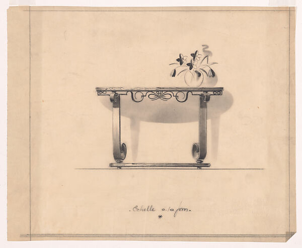 Presentation drawing for a console table with a wrought-iron base made by the Parisian firm of Edgar Brandt. The design is part of a group of fourteen drawings on transfer paper containing presentation drawings and specification drawings for a range of different types of furniture, but predominantly focused on tables and lighting fixtures. Among the tables there are designs for freestanding tables, console tables, and rolling bar carts. The lighting fixtures can be divided in chandeliers and wall sconces, some meant for candles, others for electrical light. Many of the drawings have inscriptions detailing measurements and/or scale, and for the majority a serial number is provided as well, which allows for the identification of surviving pieces of furniture.