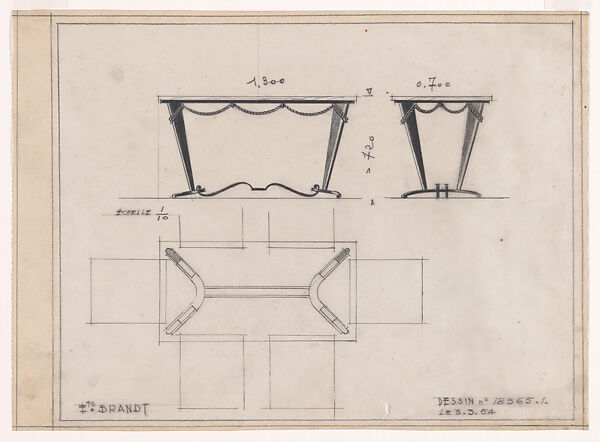 Elevation, side view, and plan for a wrought-iron table with a rope motif made by the Parisian firm of Edgar Brandt. The design is part of a group of fourteen drawings on transfer paper containing presentation drawings and specification drawings for a range of different types of furniture, but predominantly focused on tables and lighting fixtures. Among the tables there are designs for freestanding tables, console tables, and rolling bar carts. The lighting fixtures can be divided in chandeliers and wall sconces, some meant for candles, others for electrical light. Many of the drawings have inscriptions detailing measurements and/or scale, and for the majority a serial number is provided as well, which allows for the identification of surviving pieces of furniture.