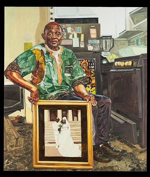 Jordan Casteel has rooted her practice in community engagement, painting from her own photographs of people she encounters. Posing her subjects within their natural environments, her oversized portraits and cropped compositions chronicle personal observations of the human experience. Yvonne and James II is a testament to the evolving relationships of respect, dignity, and reciprocity that fuel Casteel’s work. This complex composition conveys different iterations of images of the same subject, the generational passing of time, and a personal story embedded in a scene. Seated in the midst of his kitchen, James props a frame that memorializes the union decades ago to his much loved and recently deceased wife Yvonne. Behind him, stuck on his refrigerator door, is an image James cut from a poster of an earlier portrait of him by Casteel. This is her third portrait of James, who was a street vendor in Harlem when she first met, photographed, and painted him in 2015.