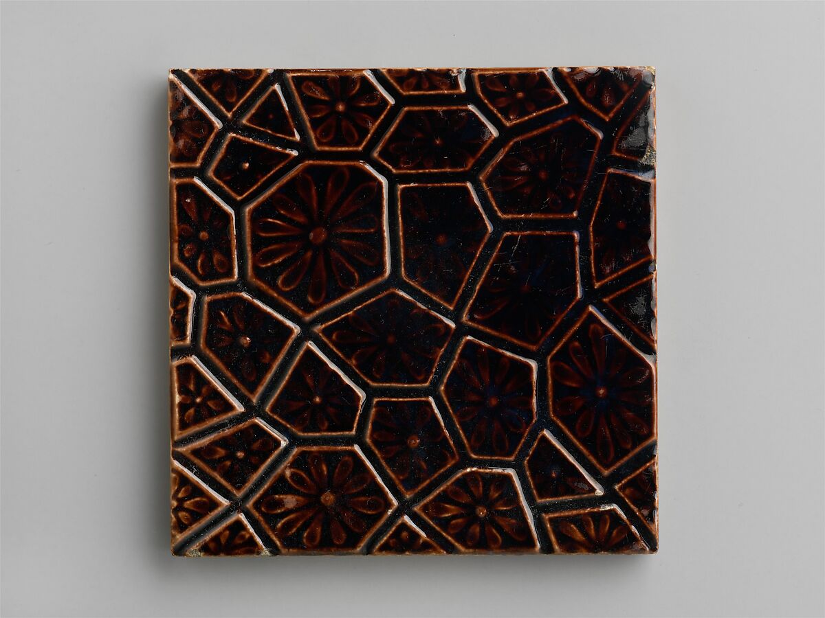 Such decorative tiles were employed in a variety of domestic and commercial settings, such as fronts for fireplaces, mantels, and soda fountains in the late nineteenth century. This brown glazed tile is decorated with daisies in a grid of hexagons and is number 415 in the 1884 Low Art Tile Catalogue. For other examples by J. and J. G. Low Art Tile Works, see 1970.100.1–.12, 1971.141, 1971.182.1–.11, 1977.373.1–.16, 1986.448.2, 1991.196.